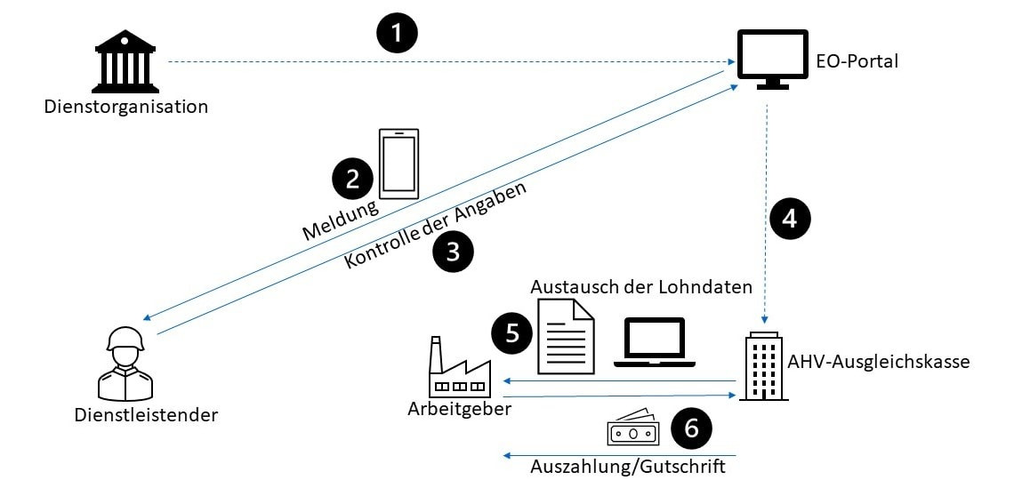 - Die Ausgleichskasse berechnet den Erwerbsausfall und löst die Gutschrift an den Arbeitgeber oder den Dienstleistenden direkt aus.